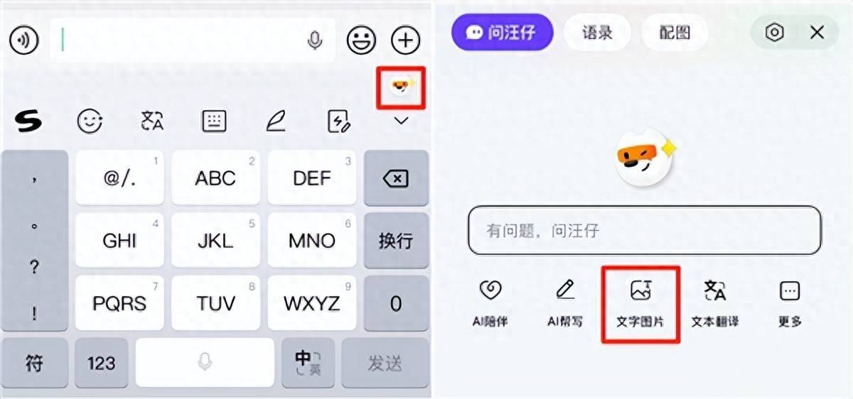 在最新版搜狗输入法中,用户只需要点击键盘右上角的“汪仔”按钮,选择“文字图片”即可体验文字一键生图功能。